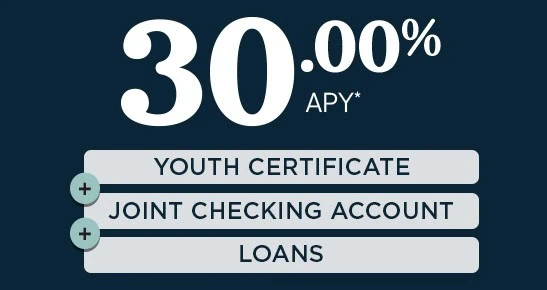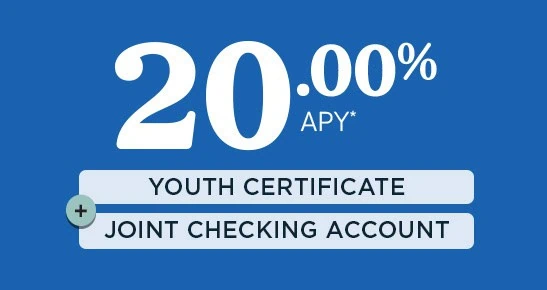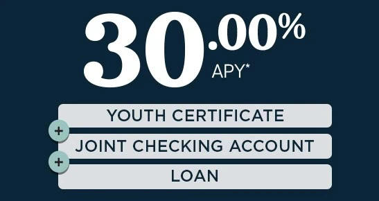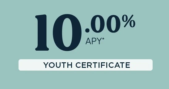 *APY=Annual Percentage Yield. Youth Certificate Special: One 10.00%, 20.00%, or 30.00% APY Youth Certificate per unique Social Security Number. Primary owner must be 0-17 years and have a qualified joint owner. Minimum opening deposit of $500 and maximum of $1,500. No additional deposits allowed once the account is opened. A penalty may be imposed for withdrawals before maturity. A checking account with a daily average balance of $100 required to earn 20.00%. A checking account with a daily average balance of $100 and an open loan required to earn 30.00%. This special promotional rate may not be combined with any other offers. Rate shown effective 04/01/2026–04/30/2026. Offer subject to end without notice. This Youth Certificate will automatically renew at the end of the term into a standard 12-month certificate unless you notify us otherwise. Membership eligibility required. Federally insured by NCUA.