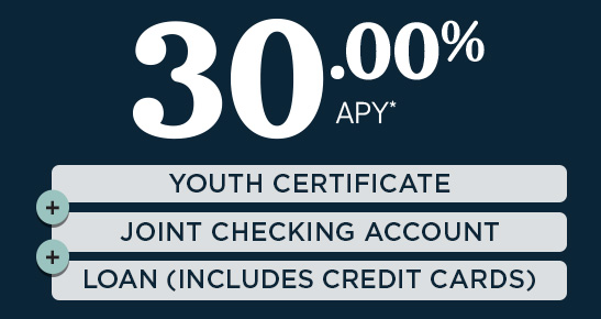 *APY=Annual Percentage Yield. Youth Certificate Special: One 10.00%, 20.00%, or 30.00% APY Youth Certificate per unique Social Security Number. Primary owner must be 0-17 years and have a qualified joint owner. Minimum opening deposit of $500 and maximum of $1,500. No additional deposits allowed once the account is opened. A penalty may be imposed for withdrawals before maturity. A checking account with a daily average balance of $100 required to earn 20.00%. A checking account with a daily average balance of $100 and an open loan required to earn 30.00%. This is a variable rate product, meaning the APY may go up or down throughout the term based on the monthly checking and loan qualifications, and will not be less than 10.00% APY in the initial term. This special promotional rate may not be combined with any other offers. Rate shown effective 04/01/2026–04/30/2026. Offer subject to end without notice. This Youth Certificate will automatically renew at the end of the term into a standard 12-month certificate unless you notify us otherwise. Membership eligibility required. Federally insured by NCUA. See the full disclosure here.